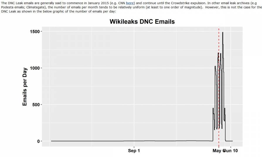 This chart shows the radical increase in average emails per day at the DNC coinciding with the Crowdstrike engagement to responde to a suspected hack of the DNC. The May 6 date is when Crowdstrike allegedly found Russians were the hackers. The June 10, 2016 date is when Crowdstrike decided to finally contain the hack and get the malware off the DNC network. The chart was prepared by Steve McIntyre, the Webmaster of the Climate Audit Wordpress blog. Mr. McIntyre's article in the blog is my main source for this article in the DNC Network part of the Election Report blog.