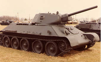 A T-34/76 Model Russian medium tank from World War II. This version has a shorter, lower velocity main gun. The T-34/85 had a longer barrel high velocity gun. The slope of the frontal armor made the T-34 harder to "kill" than the M4 Sherman medium tank used by United States and British forces in World War II. The T-34 was in the reserves of the Red (Russian) Army at least into the mid-70s or early 80s, and appeared in the 2015 WWII Victory Anniversary parades in Russia. This tank had a Christie chassis, named for US inventor Walter Christie, and was constructed at the Ford Motor Company-built facility at Gorki, and another US-provided facility at Chelyabinsk.