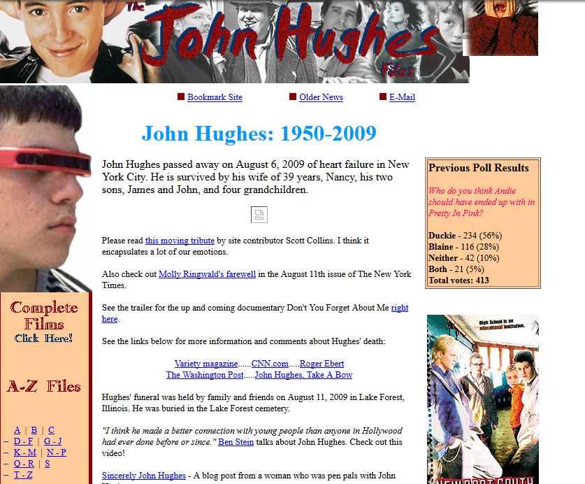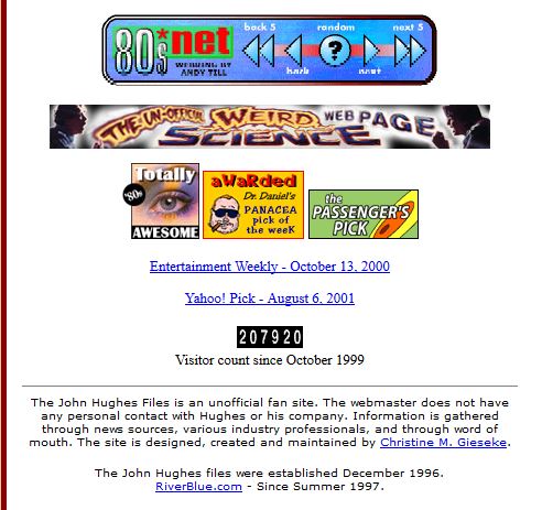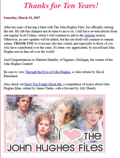 Years ago, the Tavern linked to a site called The John Hughes Files, which was mentioned in the post on the FYI Page about the death of John Hughes, the director of MSM's extremely popular movie Some Kind of Wonderful. Christine Giseske created that site in 1996, the earliest year when average Americans began putting up personal Web sites on the Internet. Ms. Giseske was in college at the time, suffered from a bout of the flu, and while absent from classes for a few days, rented and watched several Hughes movies. This inspired her to create the site which became the most prolific provider of the history of John Hughes as a filmmaker, along with the most recent developments in his career. It became a huge database of news and trivia about John Hughes and his films. Some Kind of Wonderful was frequently mentioned on the many pages, along with the performers, including Ms. Masterson. I recently became curious about the status of The John Hughes Files, and clicked on the link, only to discover the link was dead. Some years before, about 2011, Christine had informed her visitors to The John Hughes Files that the site would no longer be updated regularly. A visitor, Scott Collins, had volunteered to continue to upload recent articles, but updates would be very irregular from that point on as her life priorities had necessarily changed. Now, the site was gone. When I tried her River Blue site, for which The John Hughes Files was a satellite site, I discovered that Christine Giseske had passed away. Her site is no longer active, but is still available on The Wayback Machine. I took some screen captures from The Wayback Machine to show new visitors to the Tavern how the site looked.