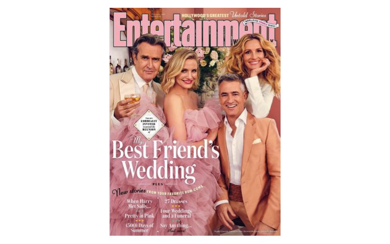 Check out the most recent copy of Entertainment Weekly, which focuses on some of the most popular Romantic Comedies (Rom-Coms) of the last few decades. Among those covered are When Harry Met Sally, 27 Dresses, Pretty in Pink, Four Weddings and a Funeral, Say Anything, but most of all for MSM fans, Some Kind of Wonderful. This special issue was built around the cast reunion for Julia Roberts' My Best Friend's Wedding with the cover showing the four main cast members, Julia Roberts, Dermot Mulroney, Cameron Diaz, and Rupert Evert. Everything on the cover seems to be pink, but if that isn't enough, just use the image above for a guide! MSM speaks in this one.