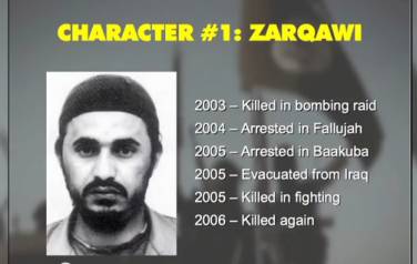 What follows are the contradictory and confused reports about what happened to "Gadahn/Pearlman" between 2008 and 2015, when the government released the "news" that "Adam Gadahn" was arrested in Pakistan in January 2010." That, as we will see, must have been tough as the mainstream media reported in 2008 that "Gadahn" had been killed in the Waziristan section of Afghanistan. Now, in 2010, the dead terrorist was captured in Pakistan. After a few years of YouTube videos exposing the dead, arrested terrorist as being a secret agent of the United States, and really a Jewish "Death Metal" musician (maybe the last word should be in quotes too), we hear that he was killed yet again in 2015. It gets confusing, I know, so maybe this image of the various events in the life of the terrorist Zarqawi might help the challenge of keeping all the contradictory stories of Gadahn's life straight. These constantly changing stories are all part of trying to navigate the unending "War on Terror."