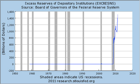 One justification for TARP and the other bailouts of the banks was to keep the banks lending so the recession would be brief and high levels of unemployment could be avoided. With the Fed paying .25% for excess reserves, all the government's bailouts failed to reduce the effects of the recession. The Fed started paying interest on reserves in July 2008, so the banks stopped lending because of the interest paid on excess reserves. The timing of all of this is fascinating as is a Justice Department policy about prosecuting "Commercial Crimes" that came out in late August 2008, about three weeks before the torpedoing of Lehman Brothers, and the resulting fallout on AIG, touched off the panic. The new prosecutorial policy made it tougher to prosecute white collar crime just before the biggest white collar crimes in the history of the universe exploded all over the economy. It was all probably an accident of some kind. We all know none of this stuff is ever planned. Guys with MBAs and Juris Doctor degrees just suddenly become, well, incompetent, that's all. Those who benefit (big time) from the sudden brain farts of the government experts are just lucky...and Lewis Black was wrong. The Flintstones was a documentary about prehistoric times.