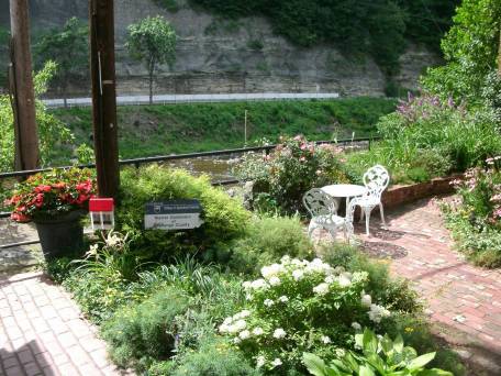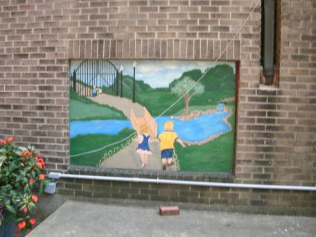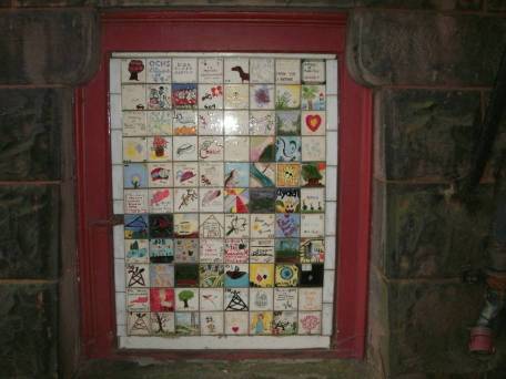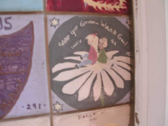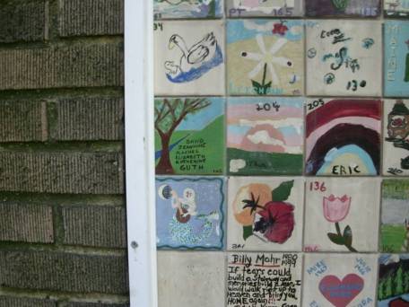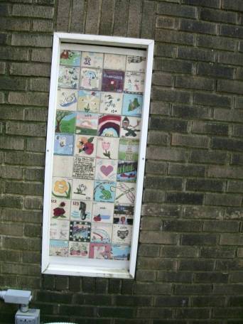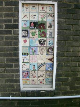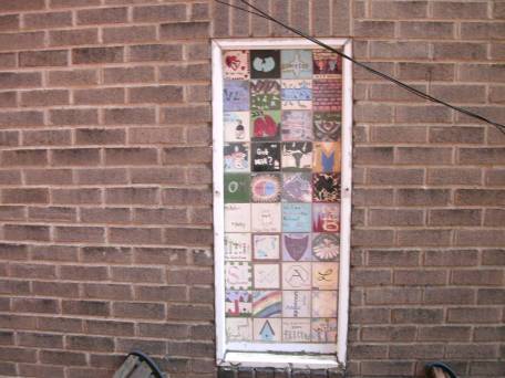 For a few years now, Oil City has had free lunch time concerts in Pipeline Alley on Northside, the old business district. I have finally attended some of those this year, and noticed some of the sights of Pipeline Alley, which is in the center of the Art District alongside the Transit Building which houses the galleries and work shops of several artists. Back in 2000, there was a project for individuals, families, and organizations to design some ceramic tiles that would be incorporated into mosaics that would be displayed in Pipeline Alley. This project was a mirror of the sidewalk bricks that were covered in a previous post on this blog. I spent some time after some of the concerts to examine the mosaics and to photograph them this past Saturday morning.