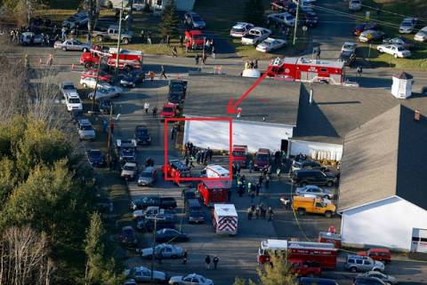 This view of the rear corner of the firehouse that dominated this footage of the Sandy Hook Firehouse activity on December 14, 2012 shows clearly that the garage-like shed is not even in this photograph it is that far away from that part of the firehouse property.