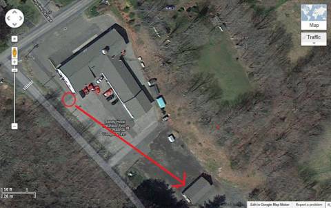 In the above photograph, you can see that the garage-type shed is located some distance away. The camera taking the shots like the first one above must be located to the left of the circle near the rear corner of the firehouse. Taking the footage at that angle should totally exclude the shed from the background as it is too far down and to the right. A subsequent photo will show just how far away the shed is from the back of the firehouse.